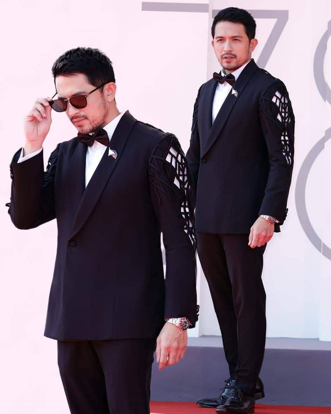 Dennis Trillo wore a custom black Francis Libiran art deco suit during the film premier and then a custom Francis Libiran art deco Barong Tagalog for the awards night, similar with the designs worn by the Philippine team last 2019 SEA Games Opening Ceremonies. Photos from Getty Images by John Phillips and from Instagram(@dennistrillo).